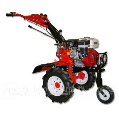 Коробка передач скоростей имеющая две передние и две реверсные скорости, расположена в чугунном корпусе. Техника оснащена мощным двигателем, что позволяет мотоблоку обрабатывать любые почвы, вплоть до целины. Двигатель запускается ручным стартером. Наличие фары дает возможность продолжать полевые работы с наступлением сумерек. Рукоятки поворотные и регулируются по вертикальной плоскости. Колеса с широким и глубоким протектором обеспечивают повышенное сцепление, в случае пробуксовки можно навесить специальные утяжелители, которые комплектуются вместе с изделием. Рычаг скоростей находится на рулевой колонке в удобной доступности.